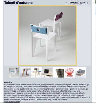 Si chiamano Arata Asada e Miwa Aoyama, giapponesi con formazione inglese. Hanno all’attivo già un bel po’ di progetti, sviluppati autonomamente e insieme, tutti molto interessanti e inusuali. Osservano la vita quotidiana e ne traggono insegnamento, per migliorare i gesti più consueti. Le sedie Cyclops (dall’occhio sulla tasca nello schienale, che serve a facilitare la presa e lo spostamento) pesano solo un chilo e sono totalmente smontabili e facilmente riassemblabili. L’ingombro dell’imballo, pensato come un packaging povero, ma raffinato, è piatto e ridotto. Utilizzano un unico foglio di metallo, piegato come origami, per ricavare due sedie con il minimo di scarti. Sono solide, comode e belle. Come dicono loro, “fatte per durare”.