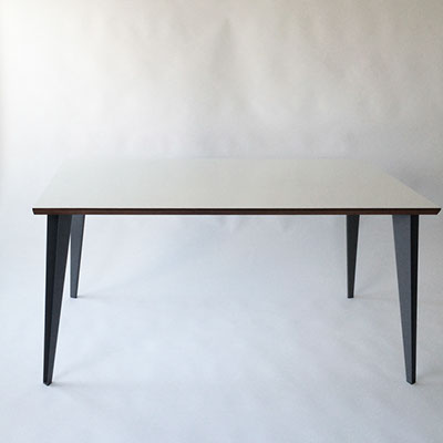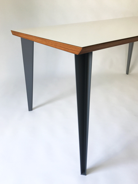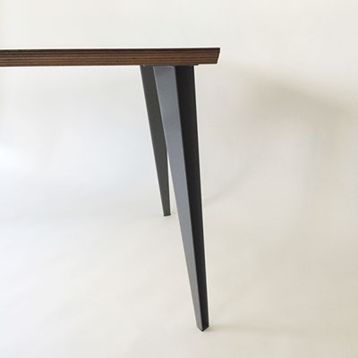 鋼板を曲げてつくるこの脚は、断面はVの字の形をしている。そのため内と外のふたつの面ができ、陰影がうまれる。