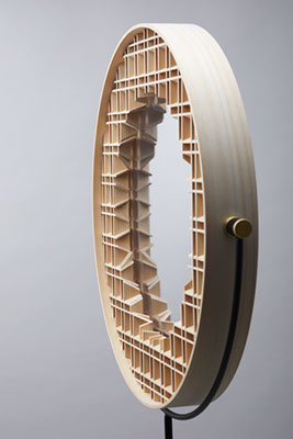 スタンド型のミラー。表と裏で意匠を変え、ミラーには反射しつつ透過するハーフミラーを使用しています。裏側のデザインと景色が、表にうっすらと映り込み、複雑な像を結びます。「鏡」の機能を一歩進めた新しいミラーです。