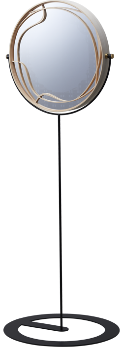 STAND is a stand type mirror. The design on the front and back of the mirror is not identical, and the mirror itself is slightly transparent. The design and the scenery of the back side of the mirror is lightly visible from the front side, creating a complex image. It takes the concept of “mirror” one step further, creating a new aesthetic.