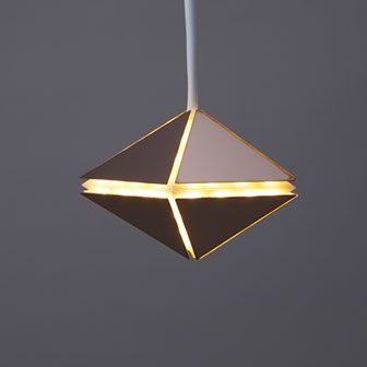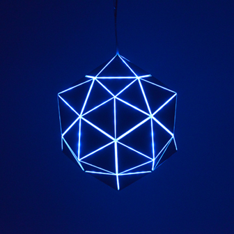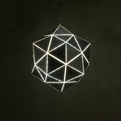 三角形を組み合わせた多面体の、辺からは線状に明かりがもれ、面では周りの光をひろってキラキラと反射します。LEDの明かりをバウンスさせることで、直行性の高いLEDの光を柔らかく、かつ均一に光らせています。