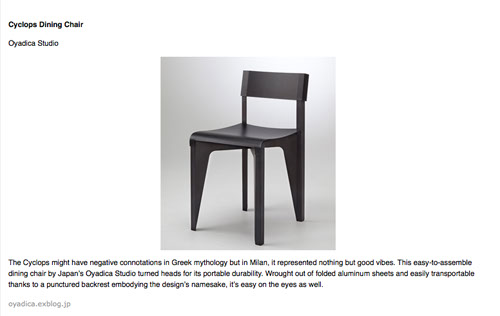 "Surface Asia", a online design magazine, ran the article which featured Japanese Product design in Milano Salone. Our "Cyclops" is also introduced in this page.